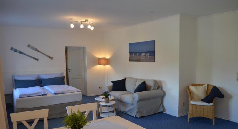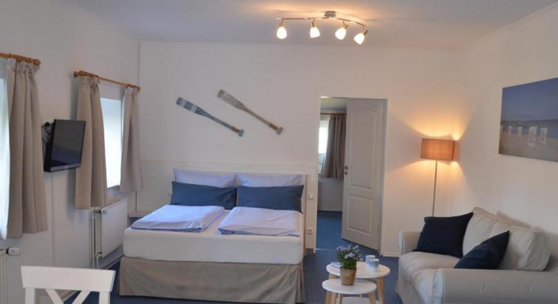Die großzügige Ferienwohnung für bis zu 4 Personen liegt in der ersten Etage. Die Wohnung bietet einen kombinierten Wohn- und Schlafbereich mit Küchen- und Essbereich.