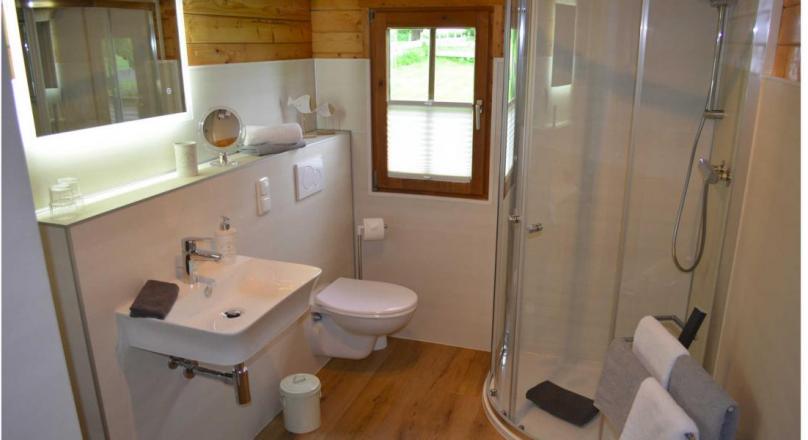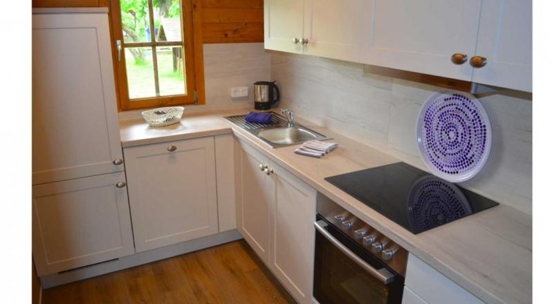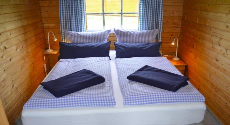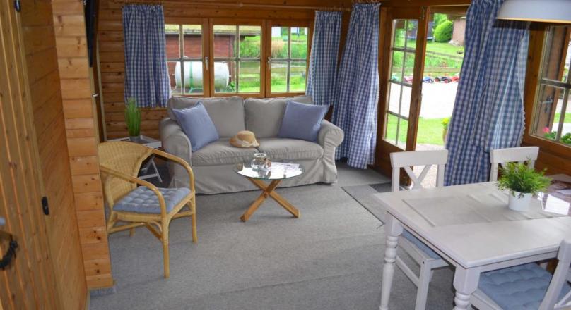 Das rustikale Ferienblockhaus bietet Platz für 2 - 4 Personen. Sie wohnen hier auf einer Ebene. Die große Terrasse läuft über Eck und bietet viel Sonne vom Morgen bis in die Abendstunden. Das Blockhaus besteht aus einem Wohnraum und zwei Schlafräumen, einer Küche und einem Bad mit Dusche und WC. Die Küche ist ausgestattet mit einem 4-Flammen-Ceran Kochfeld, Umlufthaube, Backofen, Kühlschrank mit Gefrierfach, Spüle, Geschirrspülmaschine, Kaffeemaschine, Wasserkocher und Toaster. Der kombinierte Wohnraum besteht aus einem runden Esstisch für bis zu 5 Personen und einer Couchecke mit Tisch. In dem ersten Schlafraum befinden sich ein Boxspringbett und eine Kommode. Im zweiten Schlafraum stehen zwei Einzelbetten und ein Kleiderschrank. Unsere Blockhäuser sind nur im Zeitraum zwischen dem 1.4. und dem 15.10. buchbar.